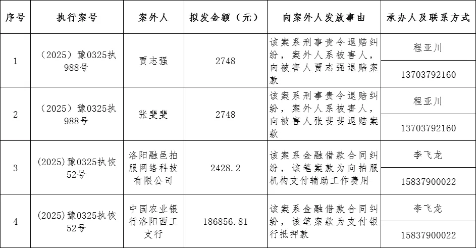 特别提示:公示期满3个自然日后,如无当事人提出异议,则该案款将向案外人发放,监督电话:0379-66335170。