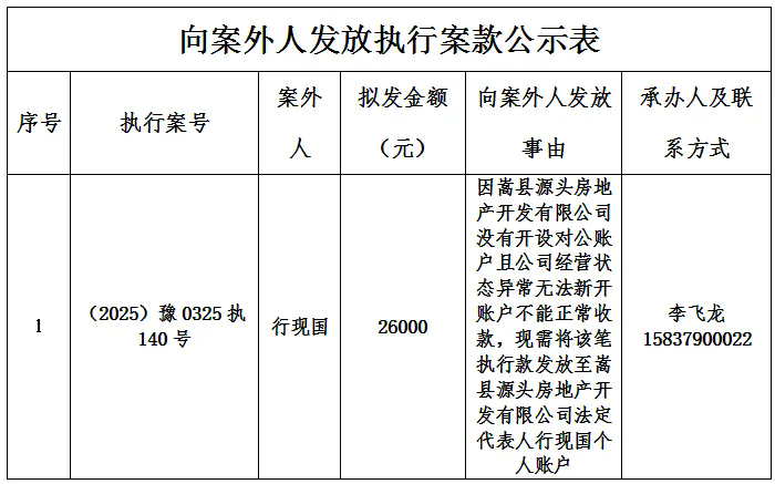 为进一步规范执行案款收发、管理,完善执行案款管理工作,维护当事人合法权益,防范廉政风险,现将嵩县人民法院拟向案外人发放执行案款情况予以公示,公示期为2025年10月23日-2025年10月25日: