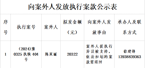 特别提示:公示期满3个自然日后,如无当事人提出异议,则该案款将向案外人发放,监督电话:0379-66335170。