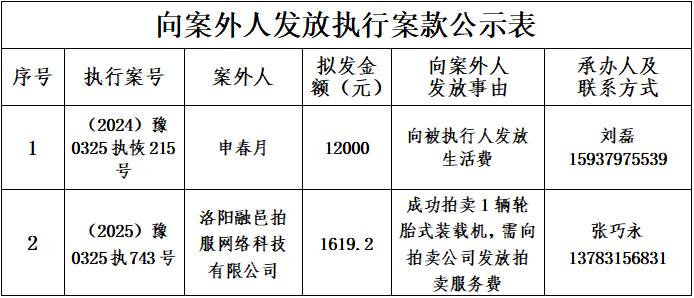 为进一步规范执行案款收发、管理,完善执行案款管理工作,维护当事人合法权益,防范廉政风险,现将嵩县人民法院拟向案外人发放执行案款情况予以公示,公示期为2025年11月19日-2025年11月21日:
