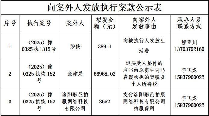 特别提示:公示期满3个自然日后,如无当事人提出异议,则该案款将向案外人发放,监督电话:0379-66335170。