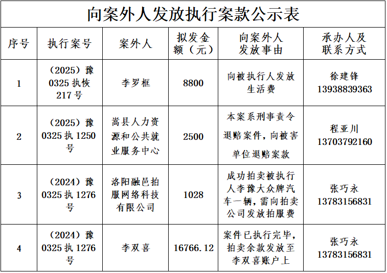 为进一步规范执行案款收发、管理,完善执行案款管理工作,维护当事人合法权益,防范廉政风险,现将嵩县人民法院拟向案外人发放执行案款情况予以公示,公示期为2025年12月10日-2025年12月12日: