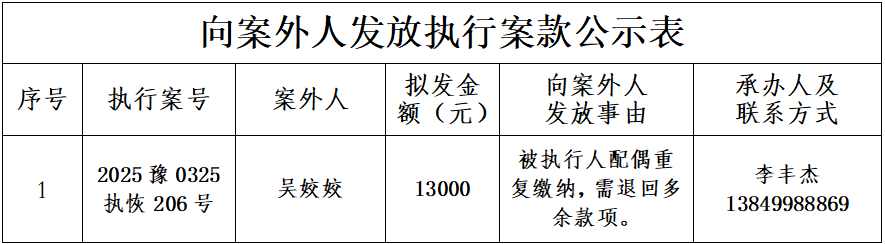 为进一步规范执行案款收发、管理,完善执行案款管理工作,维护当事人合法权益,防范廉政风险,现将嵩县人民法院拟向案外人发放执行案款情况予以公示,公示期为2025年12月17日-2025年12月19日: