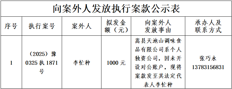 为进一步规范执行案款收发、管理,完善执行案款管理工作,维护当事人合法权益,防范廉政风险,现将嵩县人民法院拟向案外人发放执行案款情况予以公示,公示期为2025年12月18日-2025年12月20日: