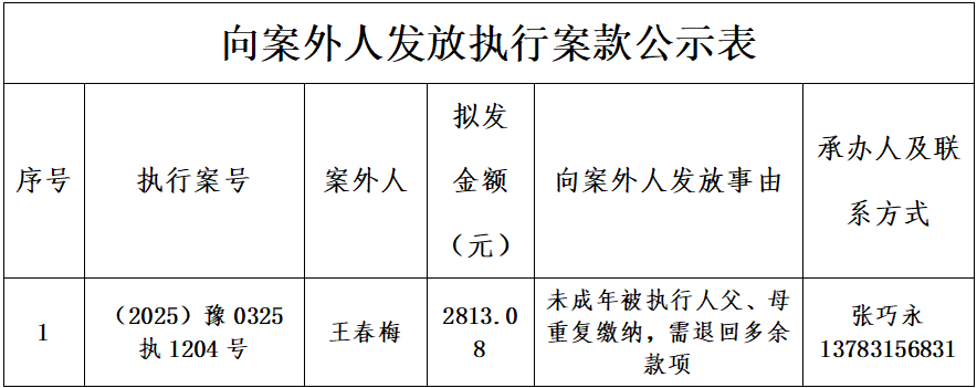 为进一步规范执行案款收发、管理,完善执行案款管理工作,维护当事人合法权益,防范廉政风险,现将嵩县人民法院拟向案外人发放执行案款情况予以公示,公示期为2025年12月19日-2025年12月21日: