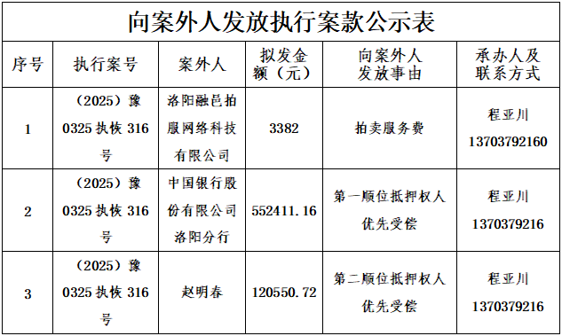 为进一步规范执行案款收发、管理,完善执行案款管理工作,维护当事人合法权益,防范廉政风险,现将嵩县人民法院拟向案外人发放执行案款情况予以公示,公示期为2025年12月25日-2025年12月27日: