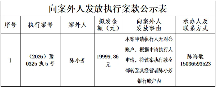 为进一步规范执行案款收发、管理,完善执行案款管理工作,维护当事人合法权益,防范廉政风险,现将嵩县人民法院拟向案外人发放执行案款情况予以公示,公示期为2026年2月12日-2026年2月14日: