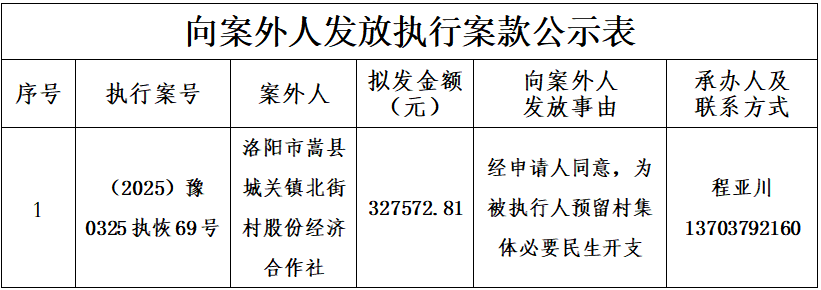 为进一步规范执行案款收发、管理,完善执行案款管理工作,维护当事人合法权益,防范廉政风险,现将嵩县人民法院拟向案外人发放执行案款情况予以公示,公示期为2026年4月24日-2026年4月26日:
